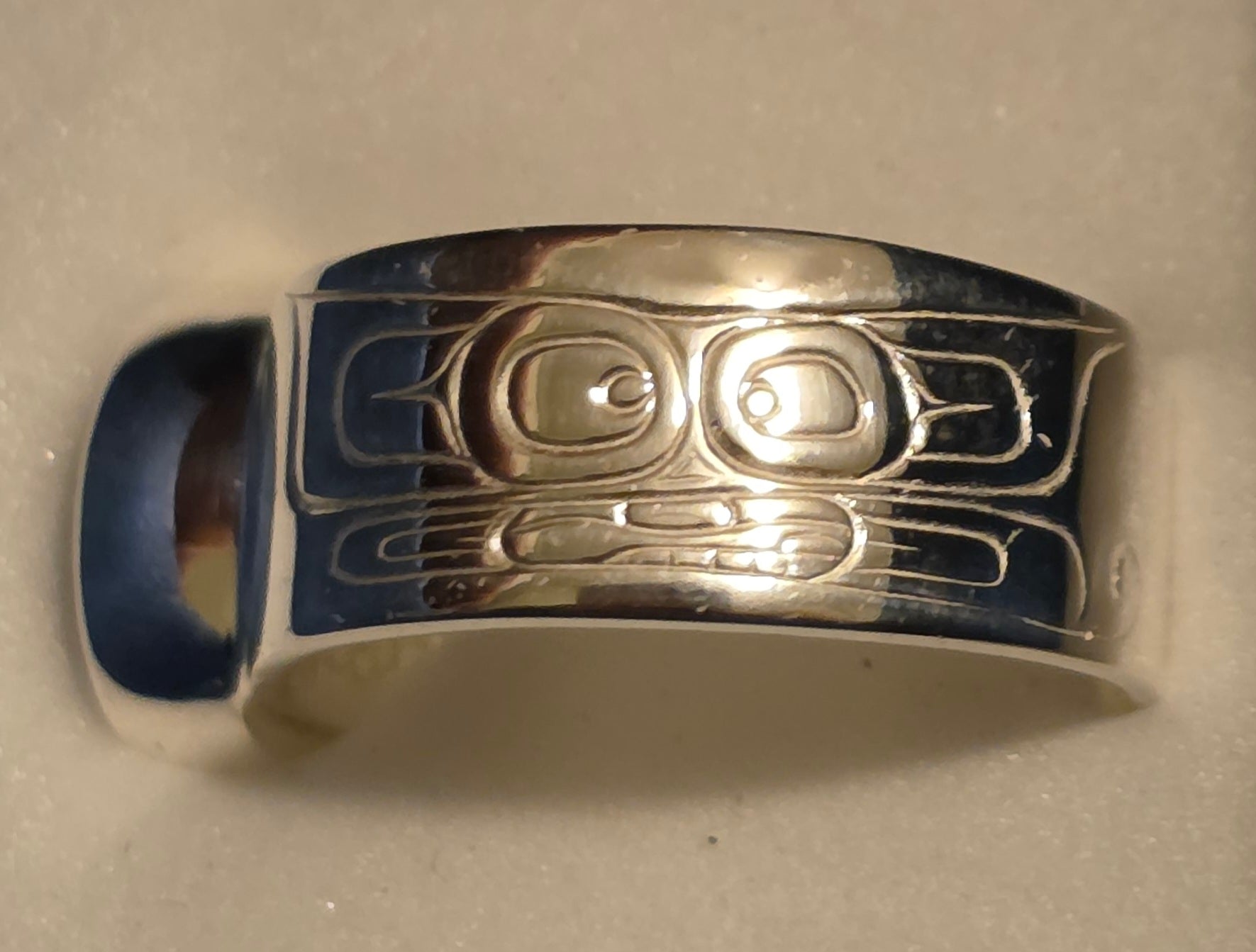 The Butterfly Connection – Sterling Silver Ring by Medicine Bear Arts is a deeply symbolic piece created in honour of his daughter She Who Dances with the Butterflies. Cast in sterling silver (stamped 925) and engraved with the artist’s signature hallmark, the ring features a butterfly and two flowers, each centred with faceted stones that reflect light and life.