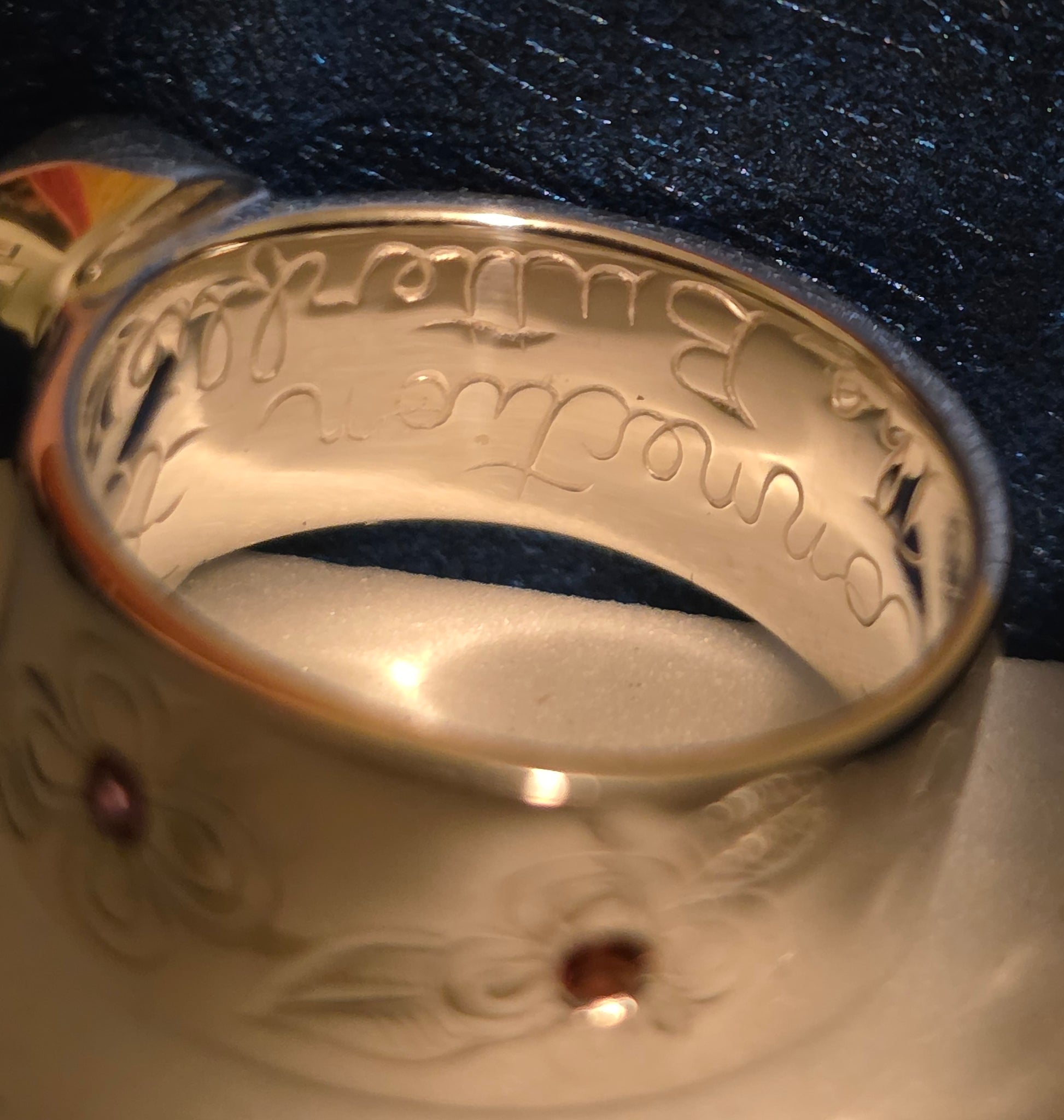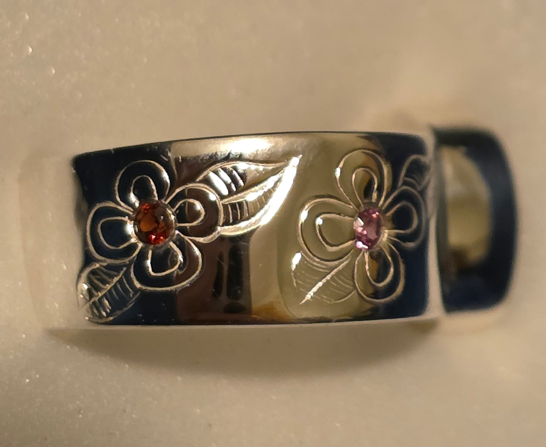 The ring has a 9 / 7. Cabachan, coming in a variety of different stones. You can acquire 4 available colors. There is a butterfly with 2 flowers with faceted stones in the center of the flowers. The inscription on the inside is connection to the butterflies Hallmark. 925 artist signature