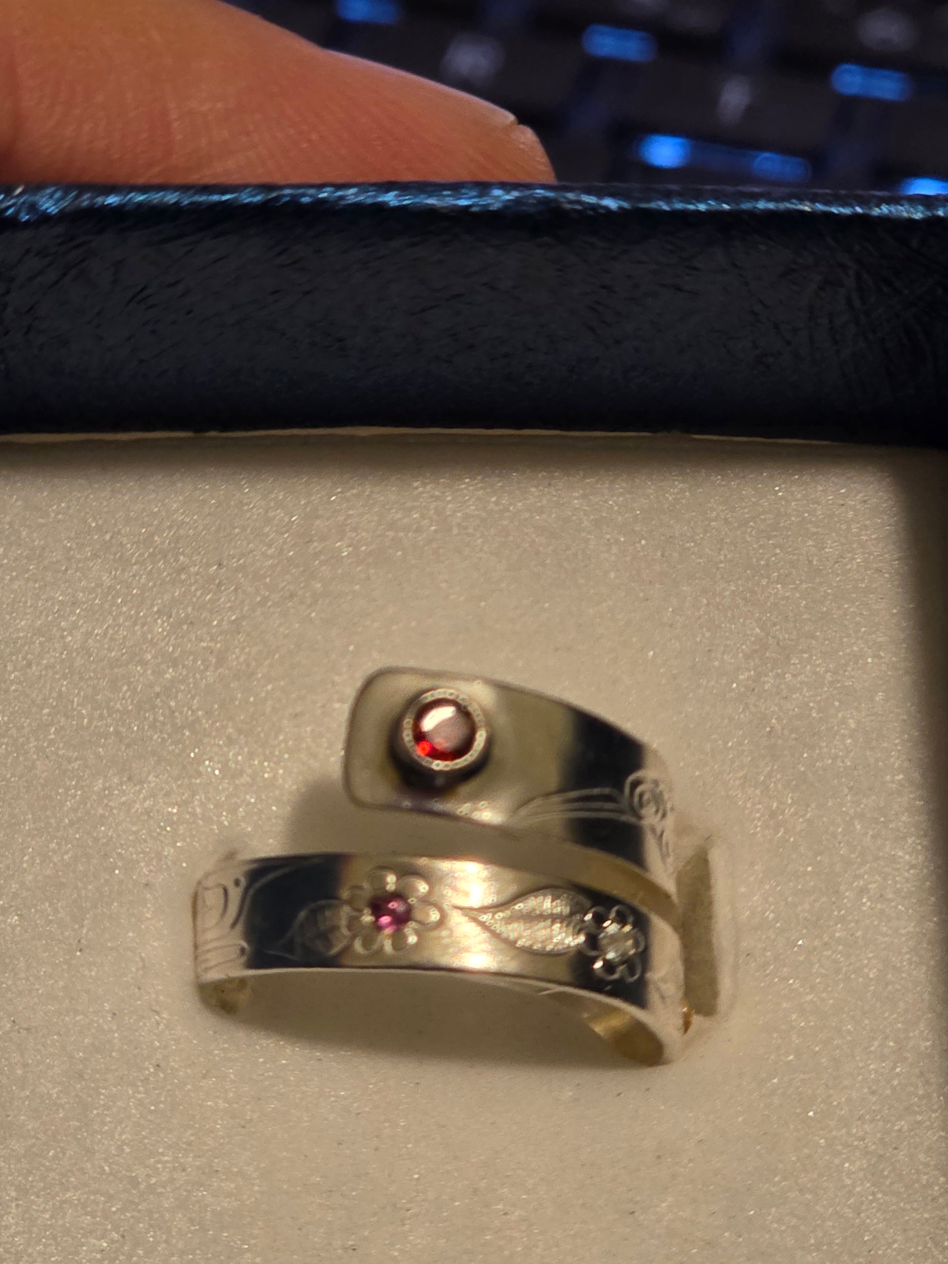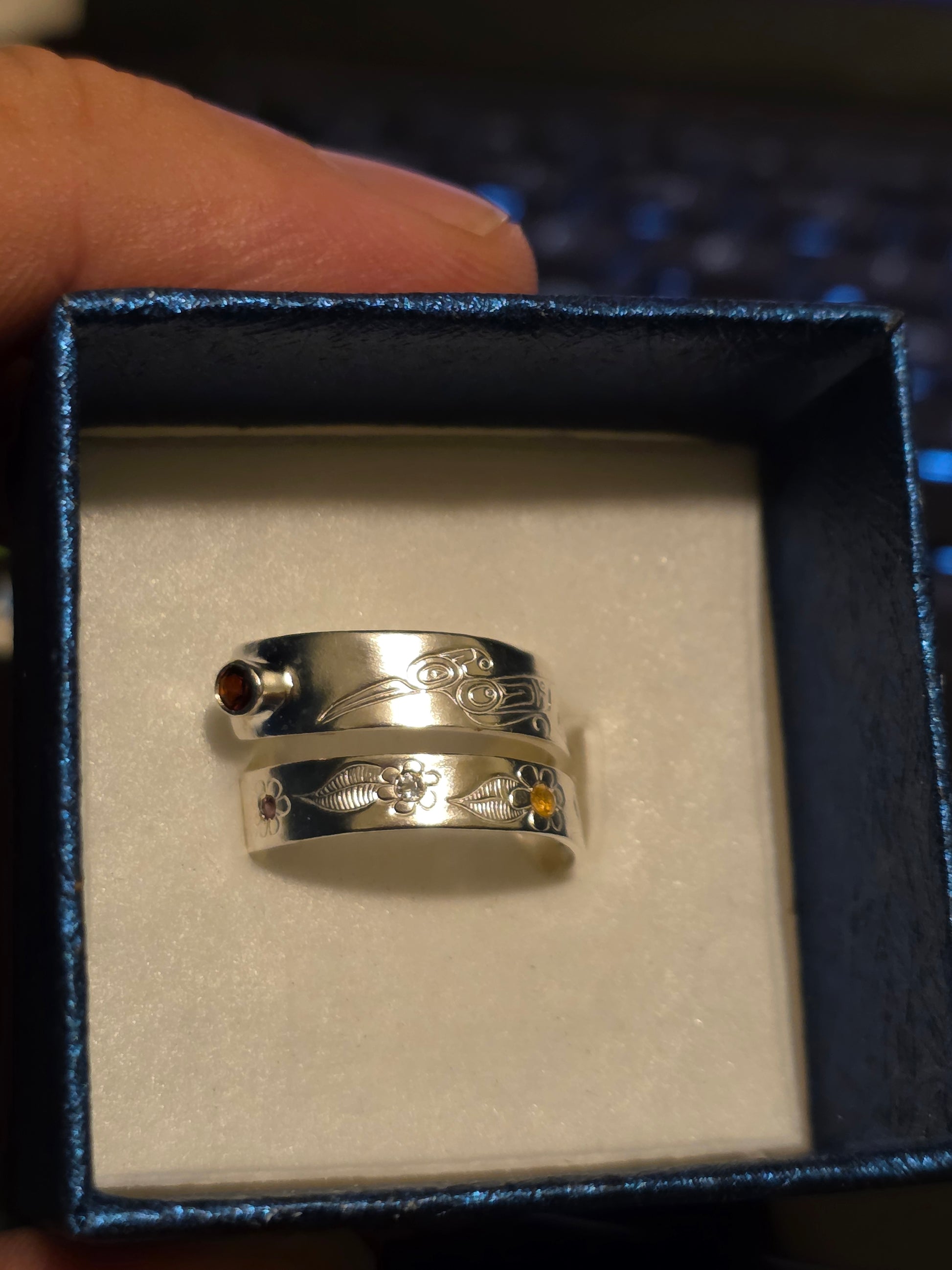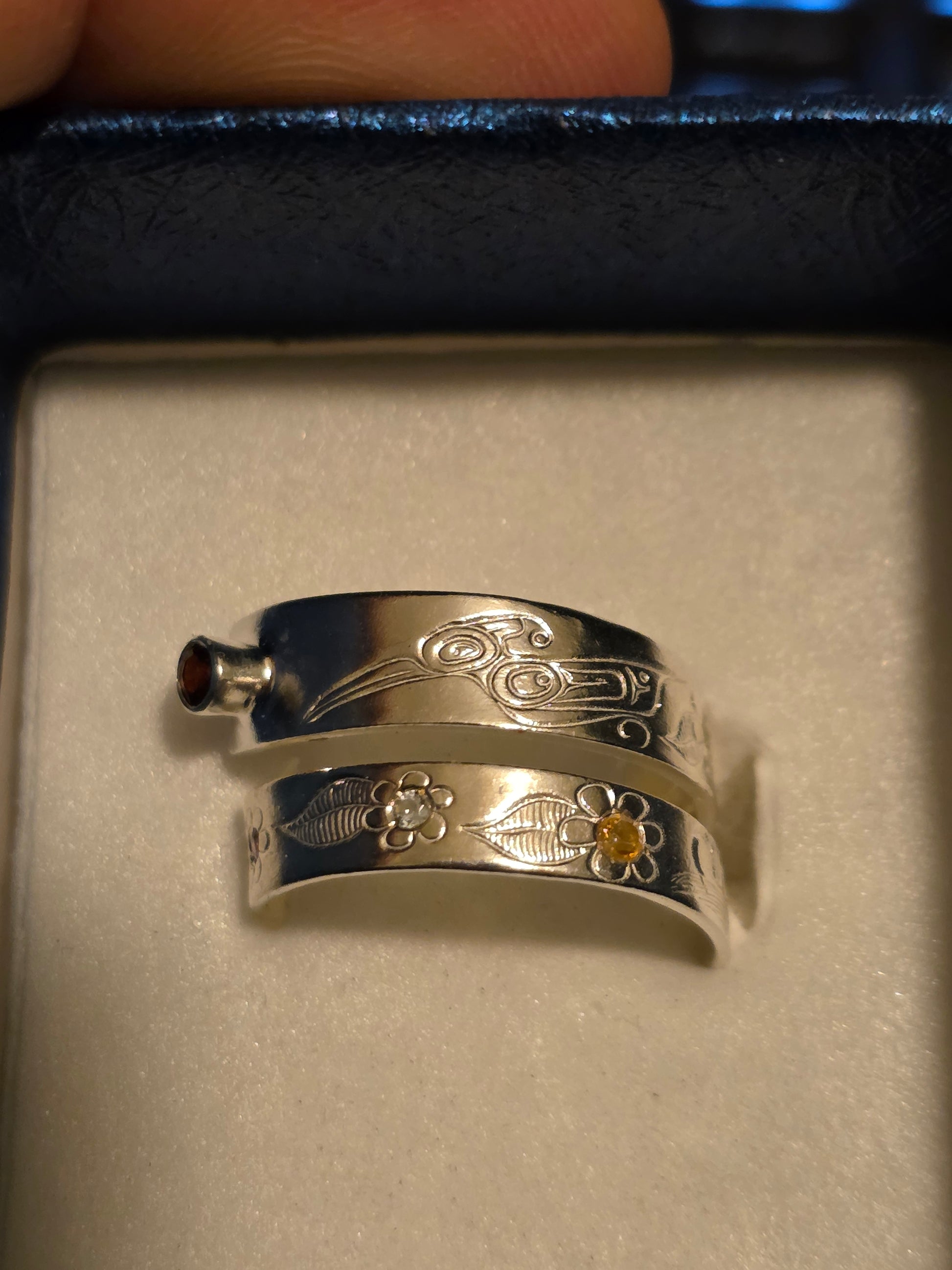 This is a silver wrapping with faceted stones. The design is a hummingbird butterfly with flowers in the center of the flowers, is inlaid faceted stones
