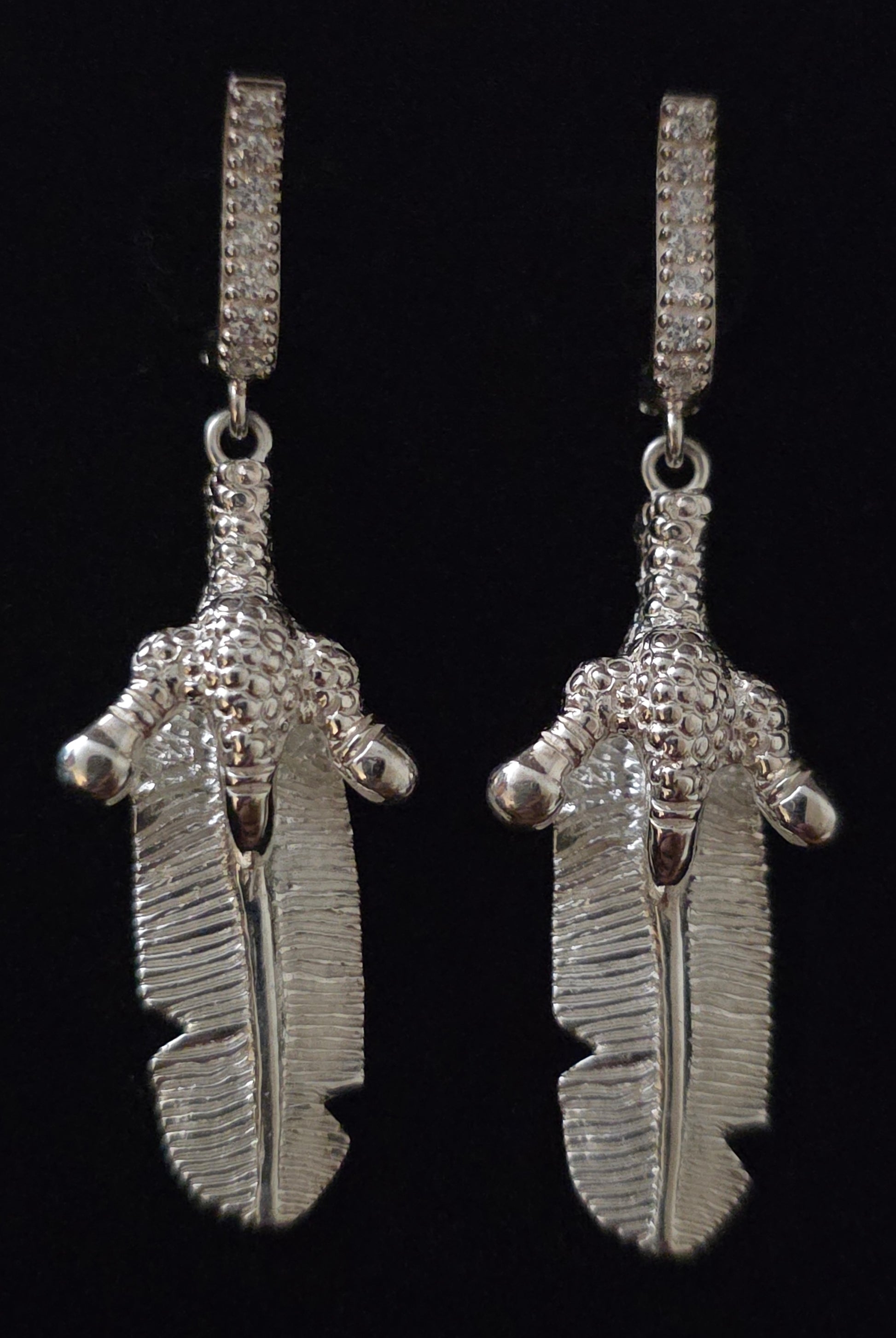 Large Eagle Claw Clutching Feather Silver Earrings Faceted