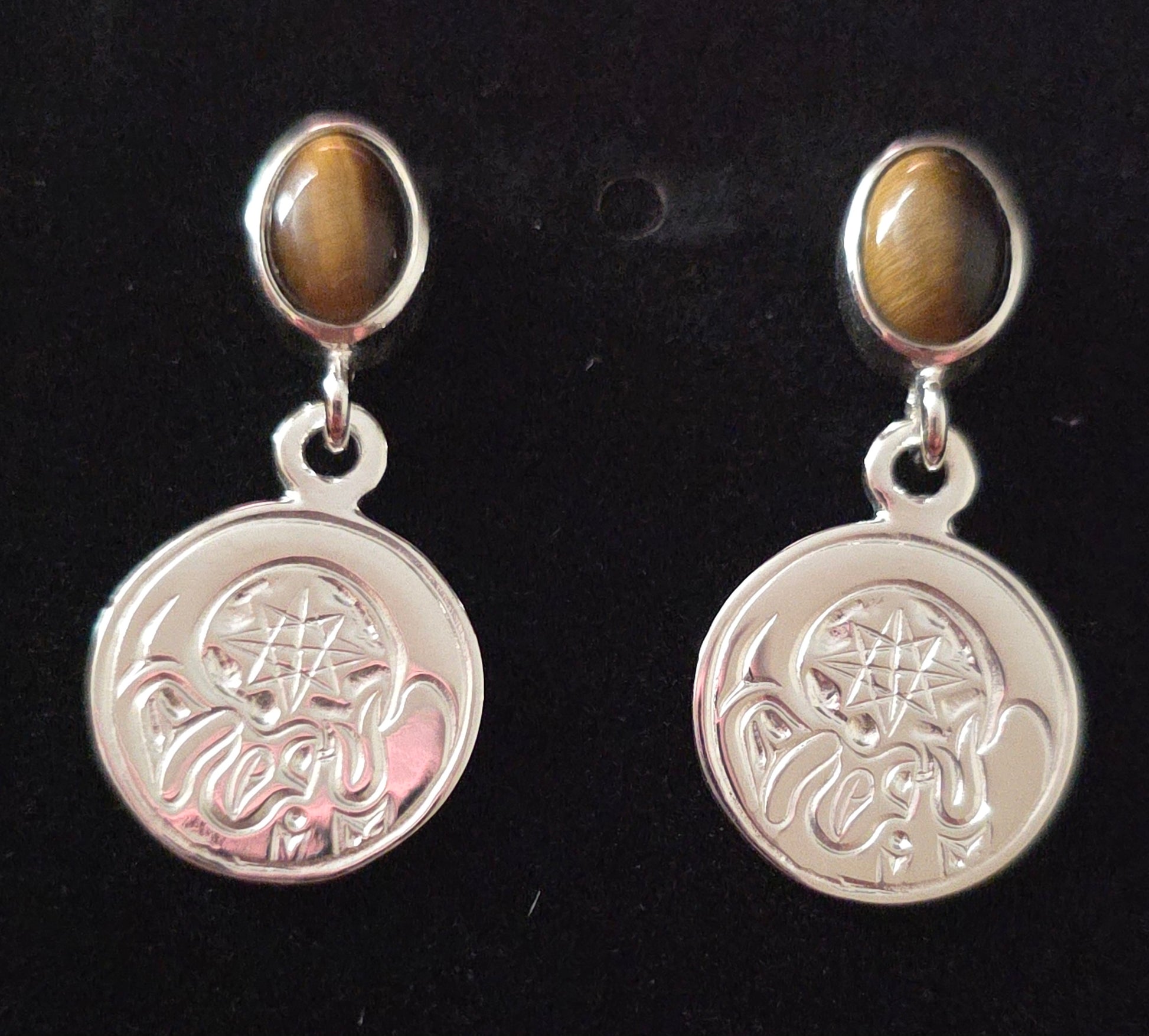 Each earring features a cabochon-set semi-precious stone, cradled within the silver, representing the inner radiance of the feminine spirit and the teachings passed down through generations.
