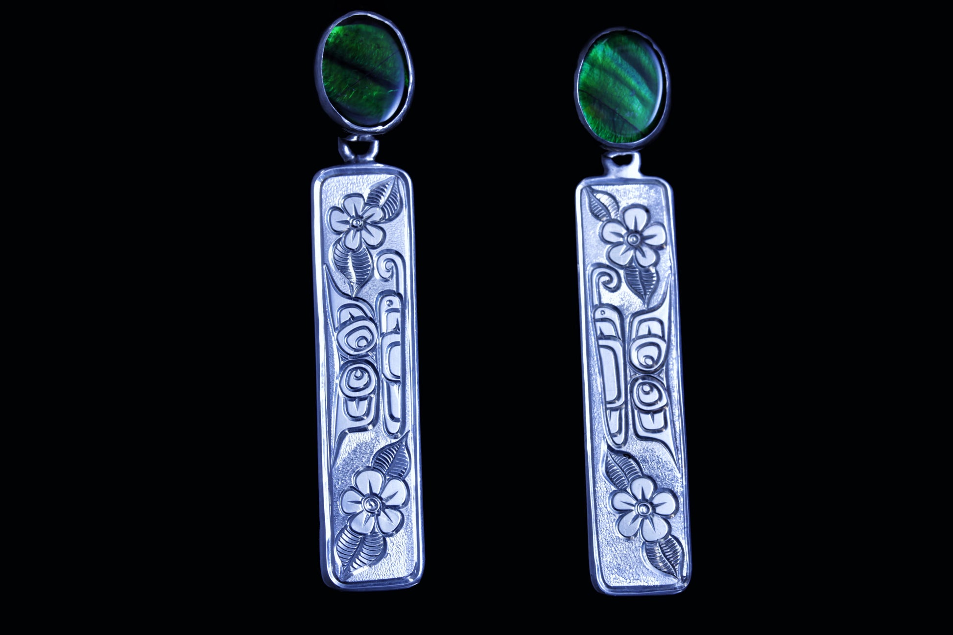 Design: Butterfly and Flowers with Ammolite inlay post earrings