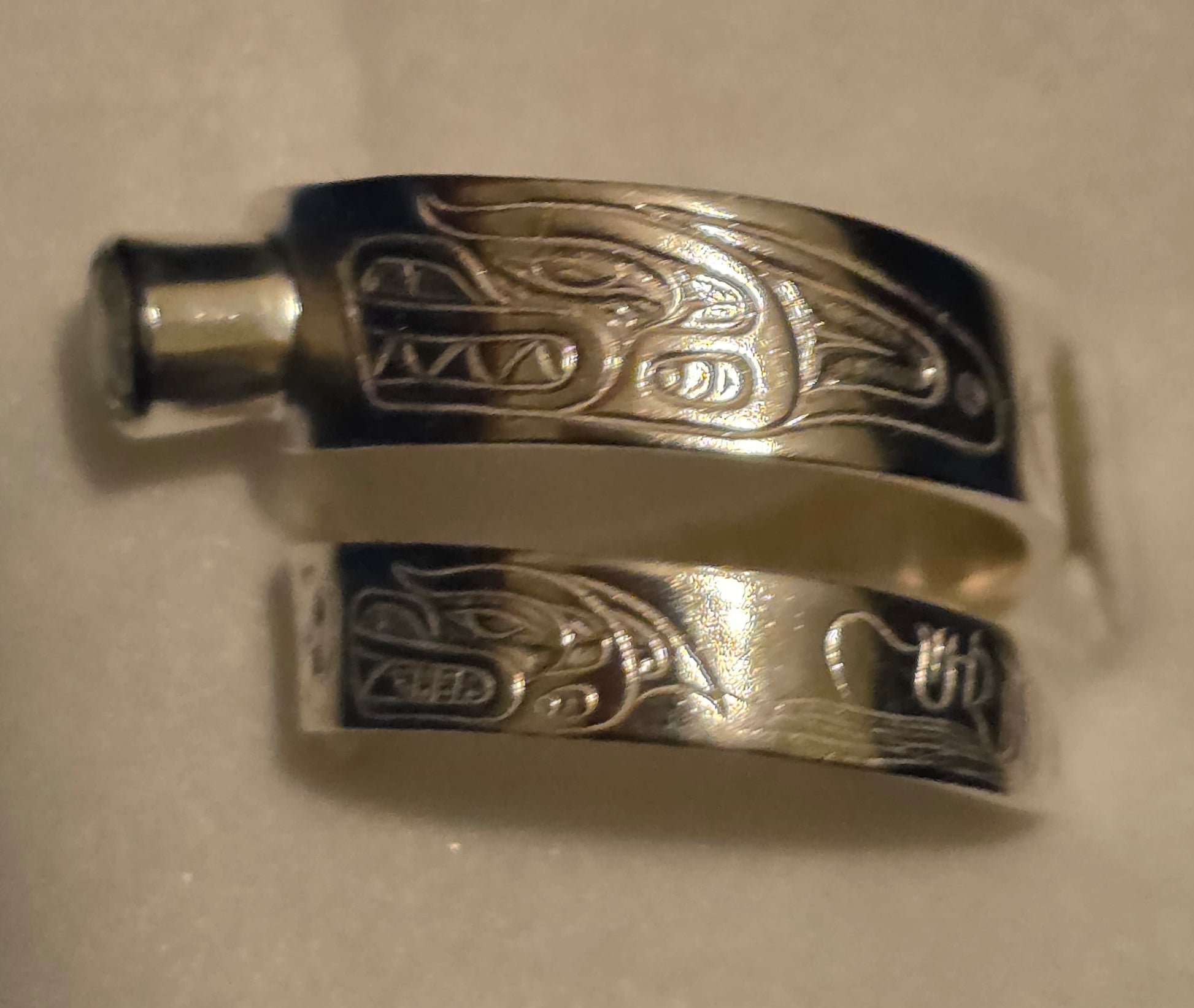 When this ring is a black fish known as an orca, a wolf with four minutes wolf, prince and then a baby wolf and a human at the end, the inscription is the sea wolf family artist's initials.I'll end up 925 hallmark