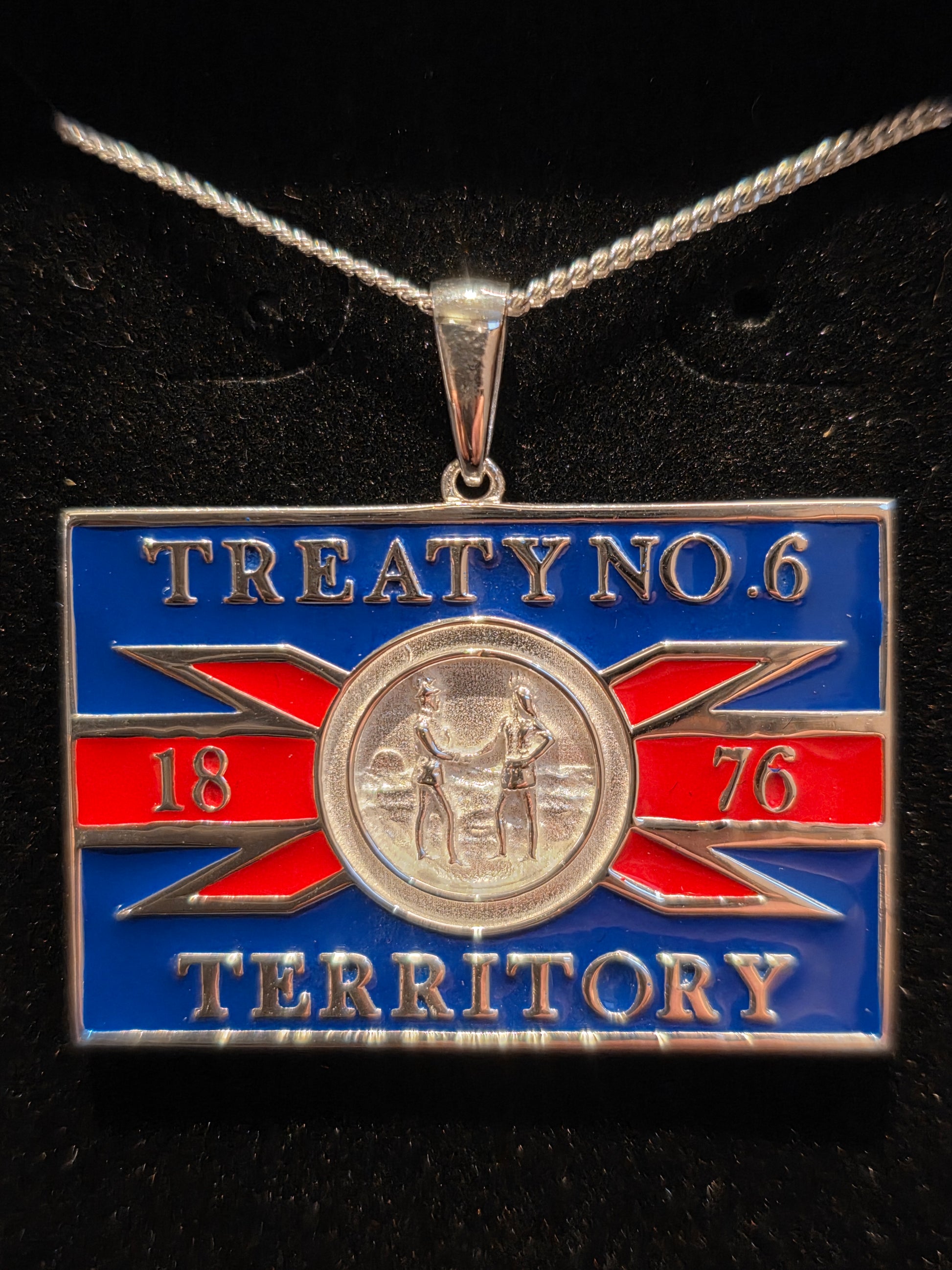 This solid sterling silver, hand-enamelled pendant celebrates Treaty 6, signed in 1876 between the Cree (Plains & Woodland), Saulteaux, Nakota, Stoney, and Assiniboine peoples and the Crown. For many, Treaty 6 represents sovereignty, resilience, and unity.