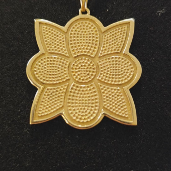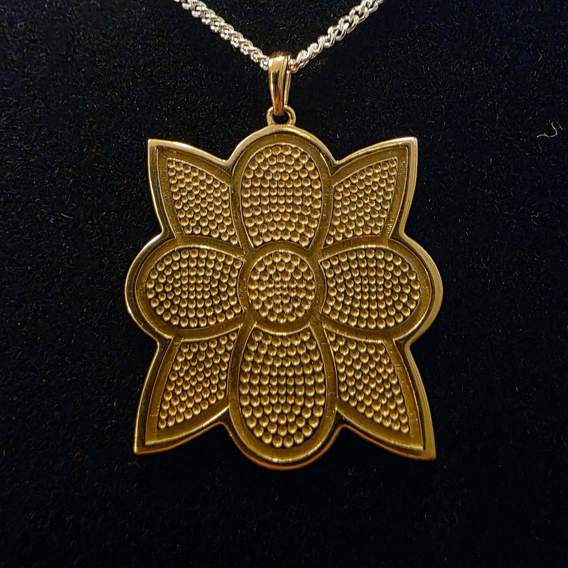 The Golden Blossom – Floral Beadwork Brass Pendant (30 mm) by Medicine Bear Arts is cast in brass and suspended from a fine Italian-made sterling silver chain. Inspired by Lady of the Thunderbird's and her traditional beadwork patterns, this pendant merges ancestral artistry with a warm golden finish.