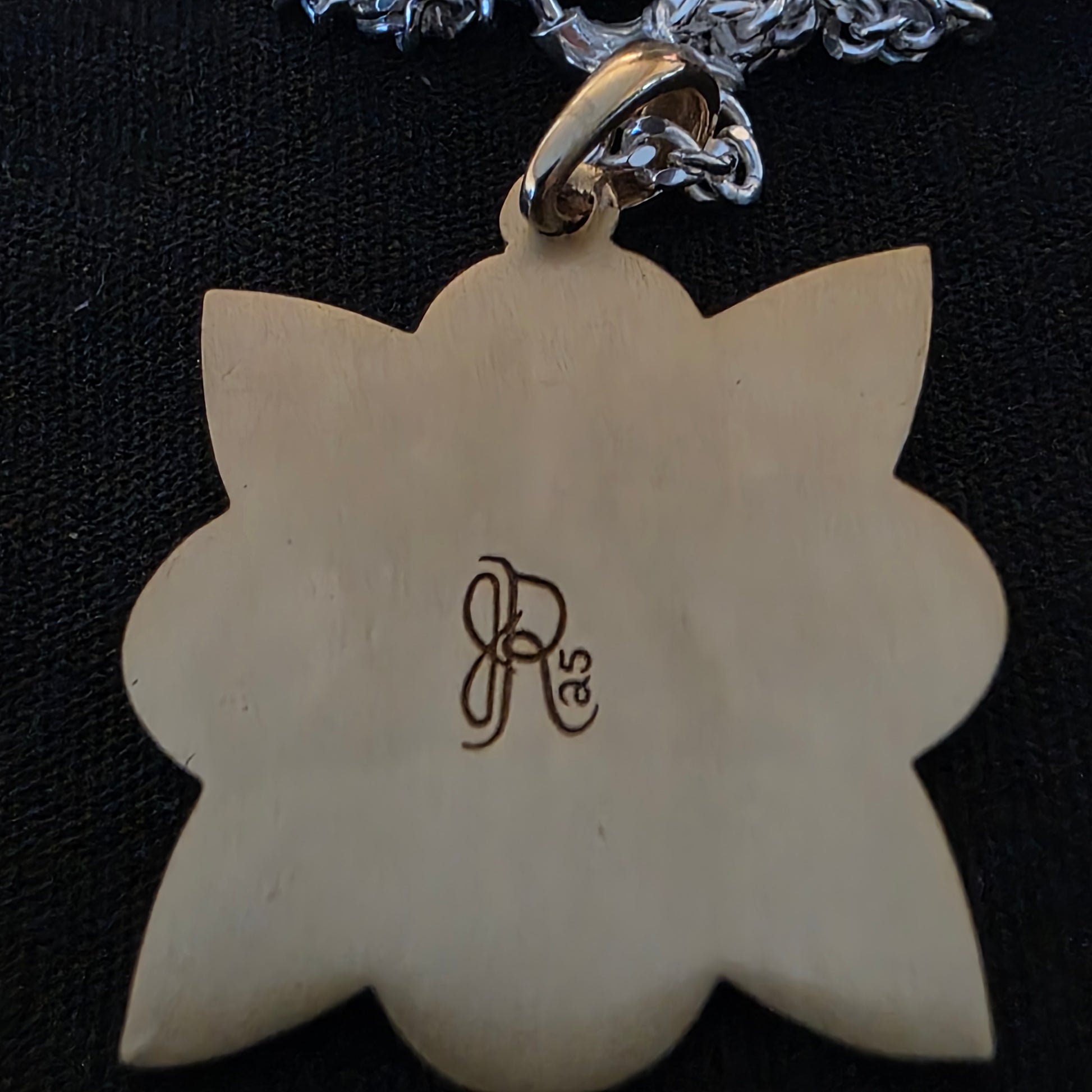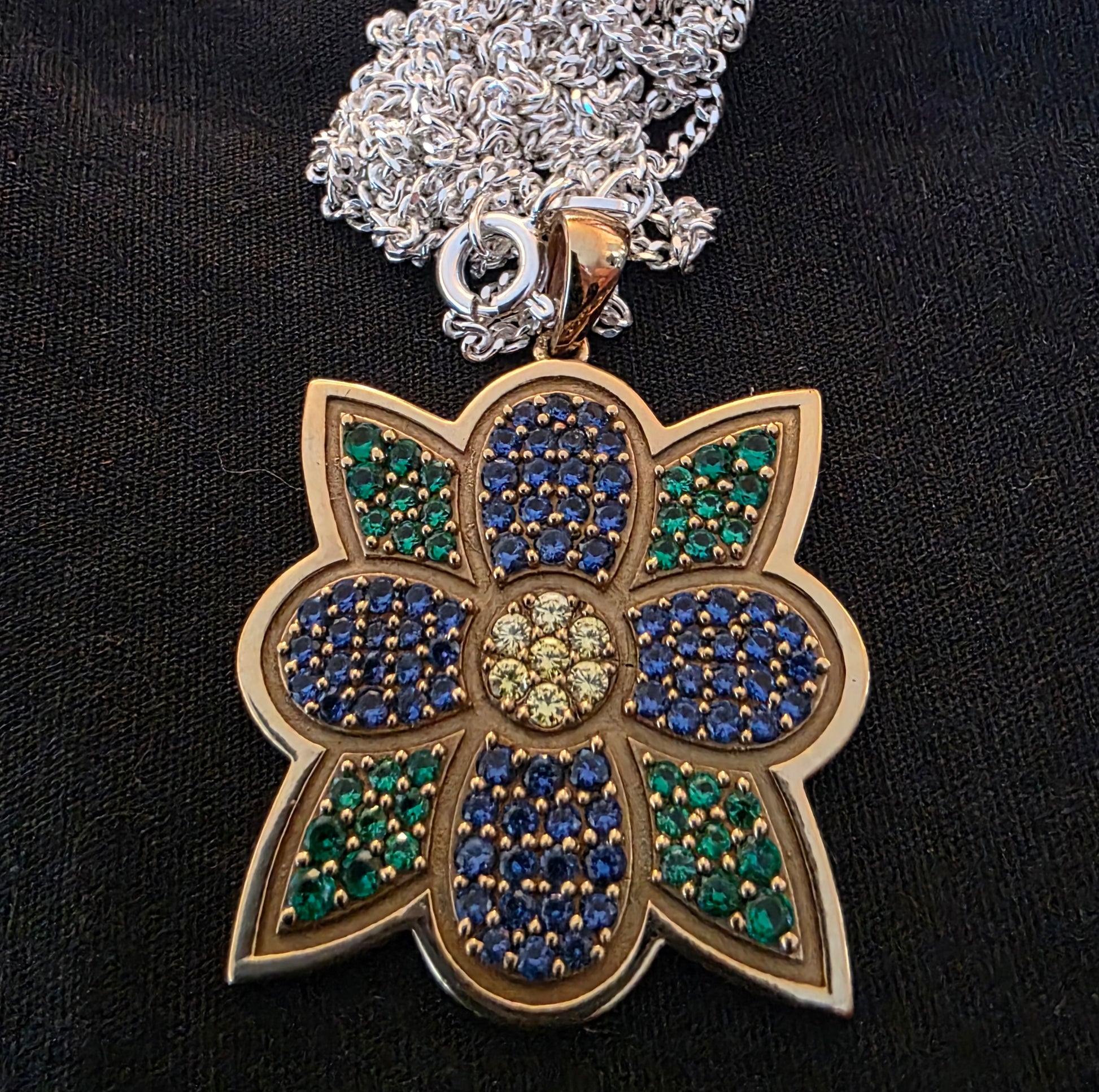 Floral Beadwork Brass Pendant (Medium) by Medicine Bear Arts is a breathtaking showpiece, cast in brass and adorned with faceted coloured stones that shimmer with brilliance. Each pendant is engraved on the back with the artist’s signature hallmark, symbolizing authenticity and artistry.