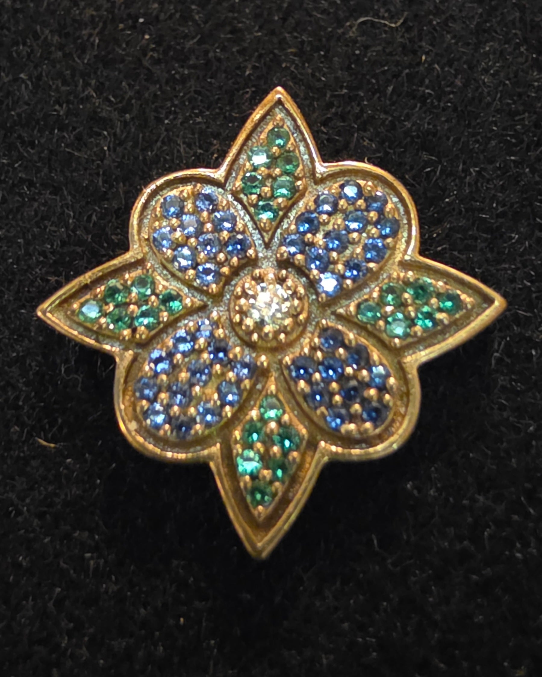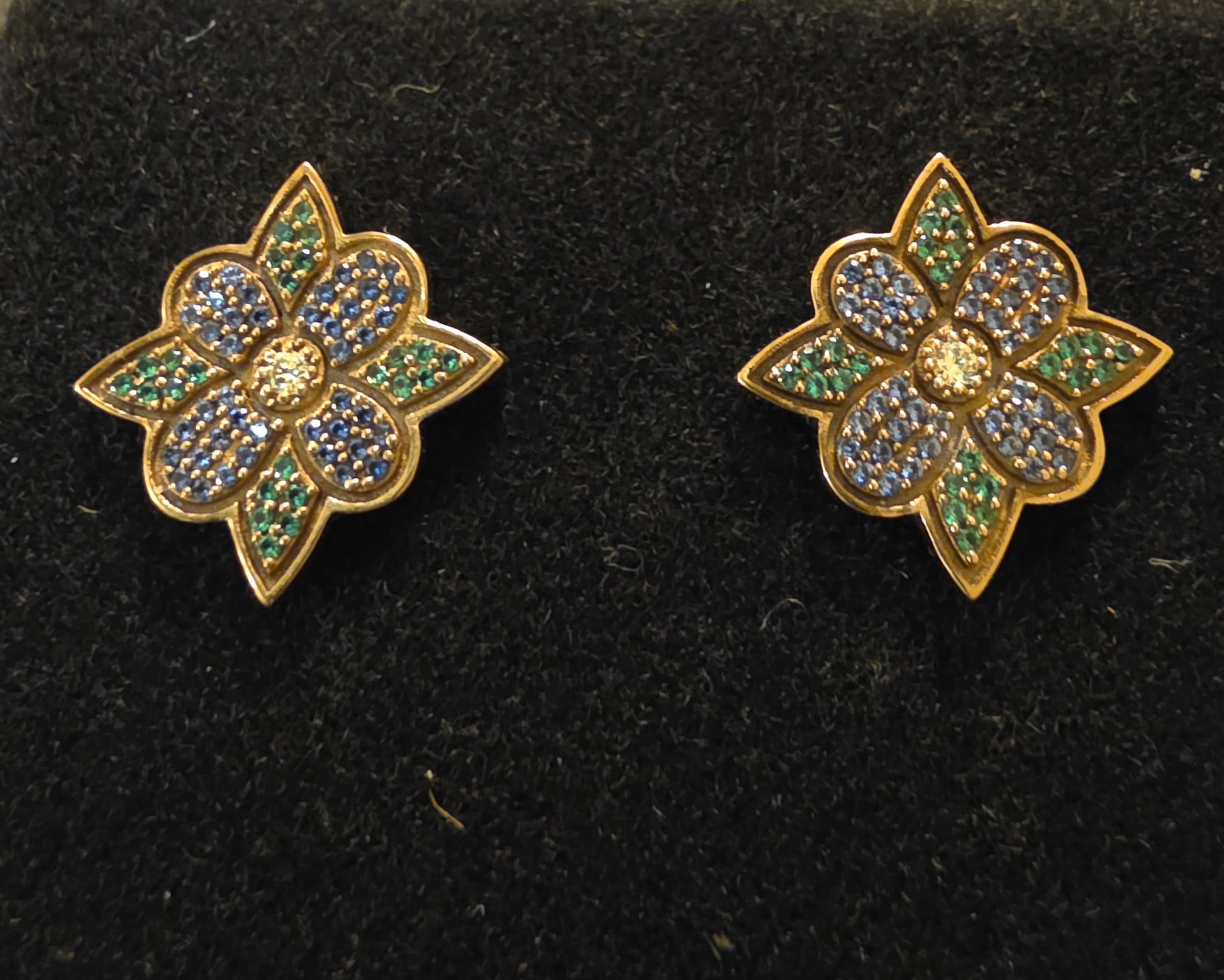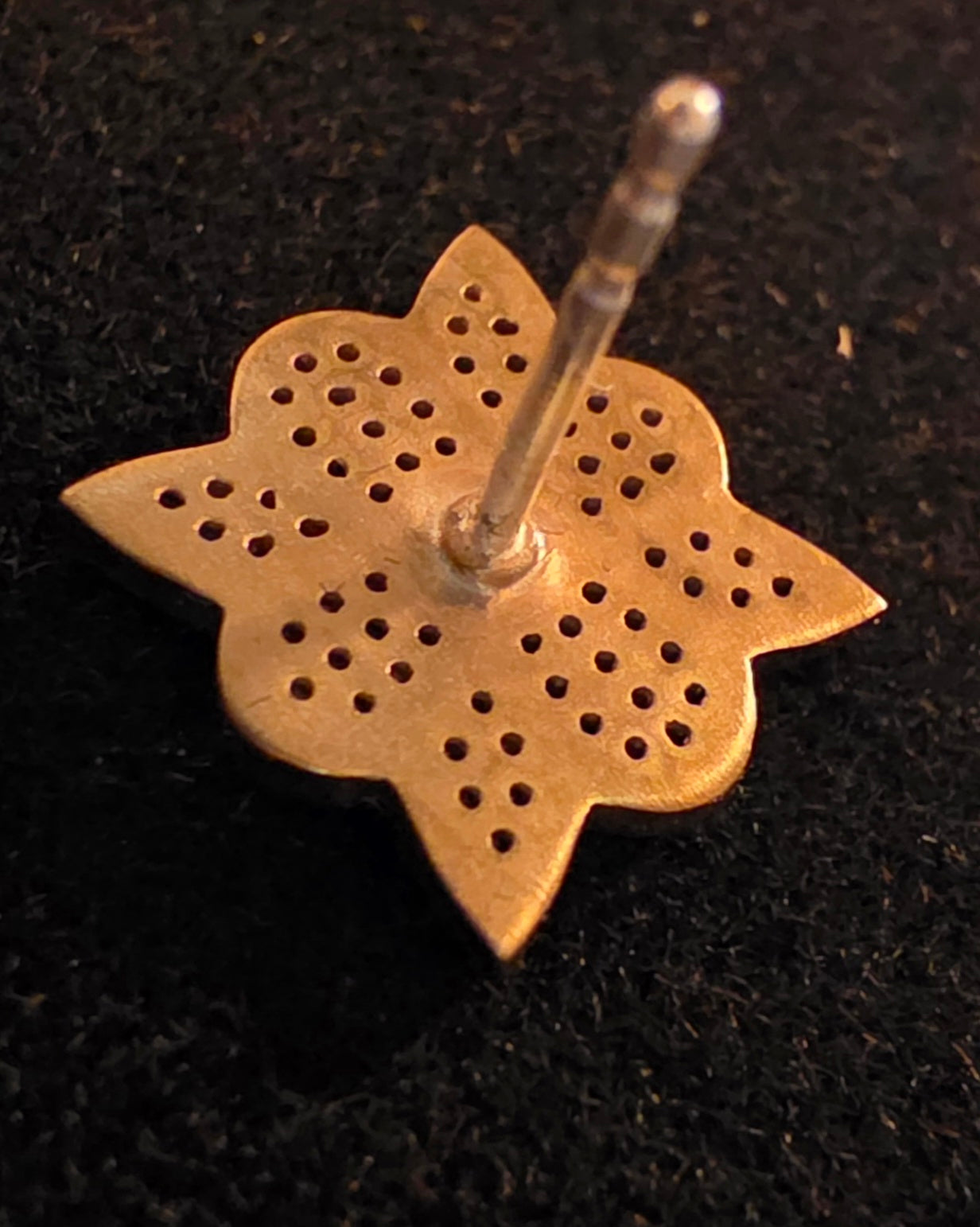 Floral Bead work Brass Studs by Medicine Bear Arts are cast in brass with sterling silver posts and accented by faceted coloured stones that bring each floral pattern to life. Inspired by the timeless bead work of Lady of the Thunderbird's, these earrings blend traditional artistry with vibrant modern design.