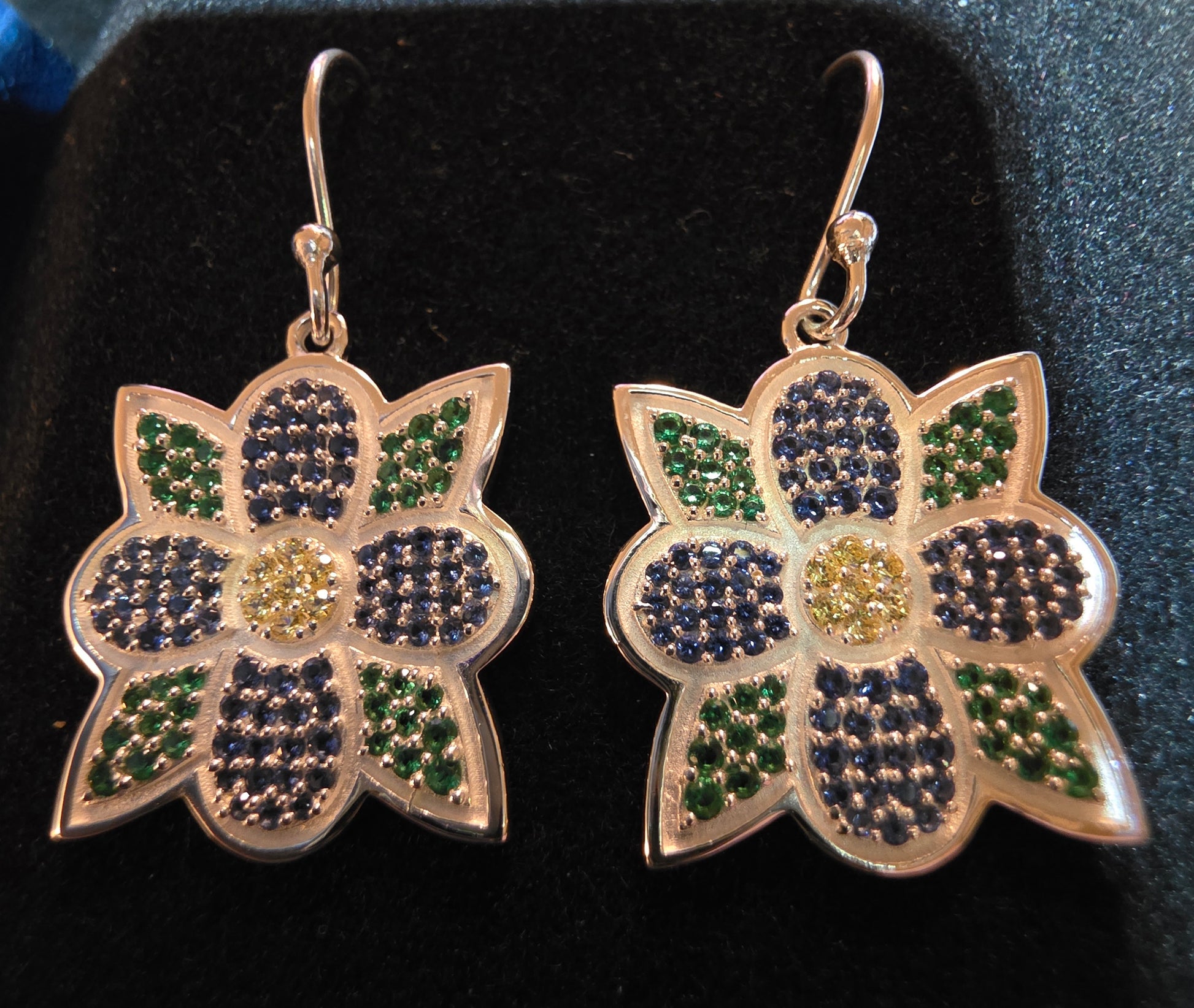 Floral Beadwork Silver Earrings (20mm) by Medicine Bear Arts are cast in sterling silver (stamped 925) with elegant shepherd hooks for comfortable wear. Each piece features faceted coloured stones that bring vibrancy and depth to the traditional floral pattern inspired by Lady of the Thunderbird's.